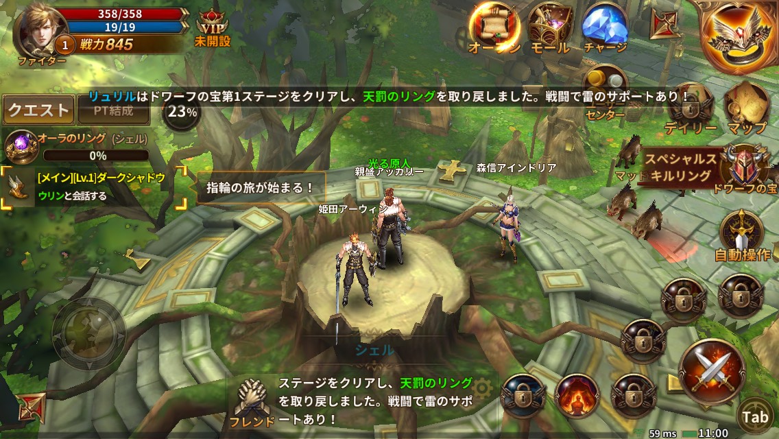通常画面はこんな感じです。基本的には画面の左にクエストが表示されるので、それをタップすれば自動的に進行します。