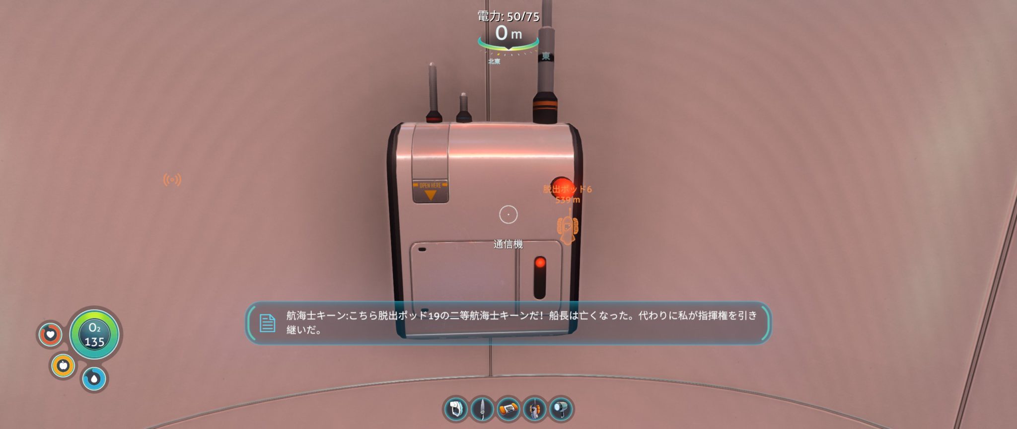 ちなみに脱出ポッド4に関しては、しばらくストーリーを進めていれば通信機に連絡が入り、画像データを見ながら探しに行くことになります。ここで先に探しに行っても良し、通信連絡が来てから行っても良しです。