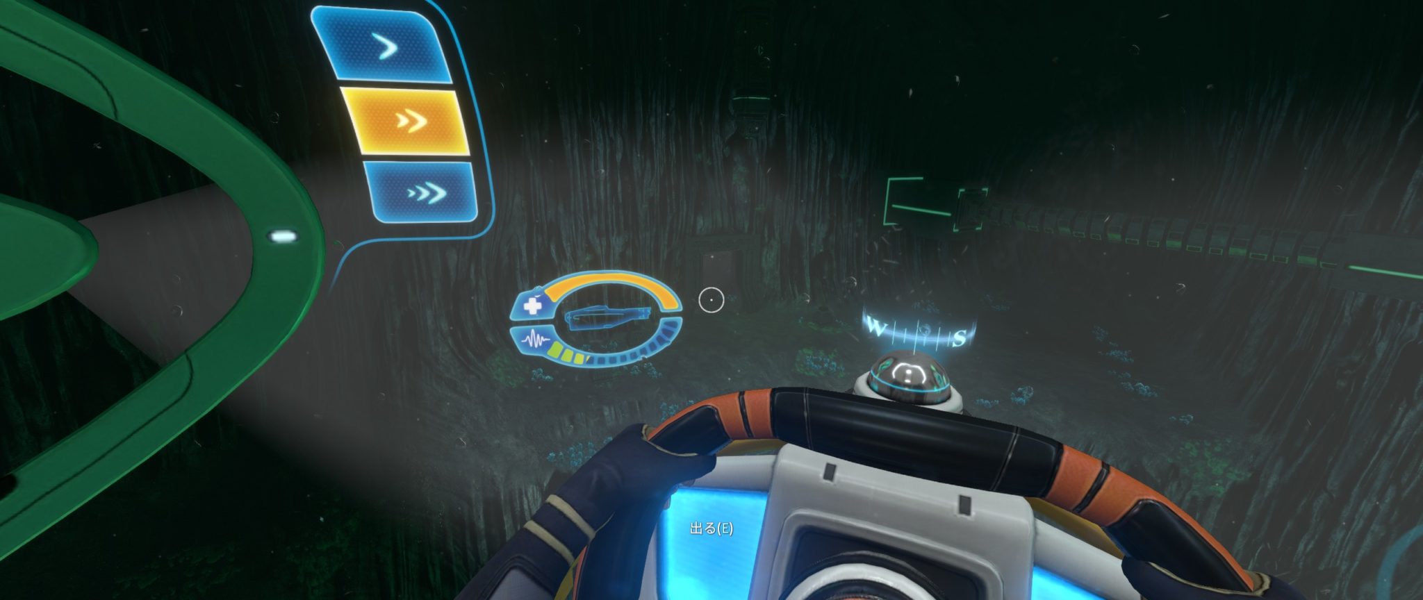 その下の矢印は速度調整です。1番下にすれば速く移動ができますが、エンジンに負担が掛かっている的なメッセージが流れるので、敵生物にしつこく襲われている時などの緊急用にするのがベターだと思います。