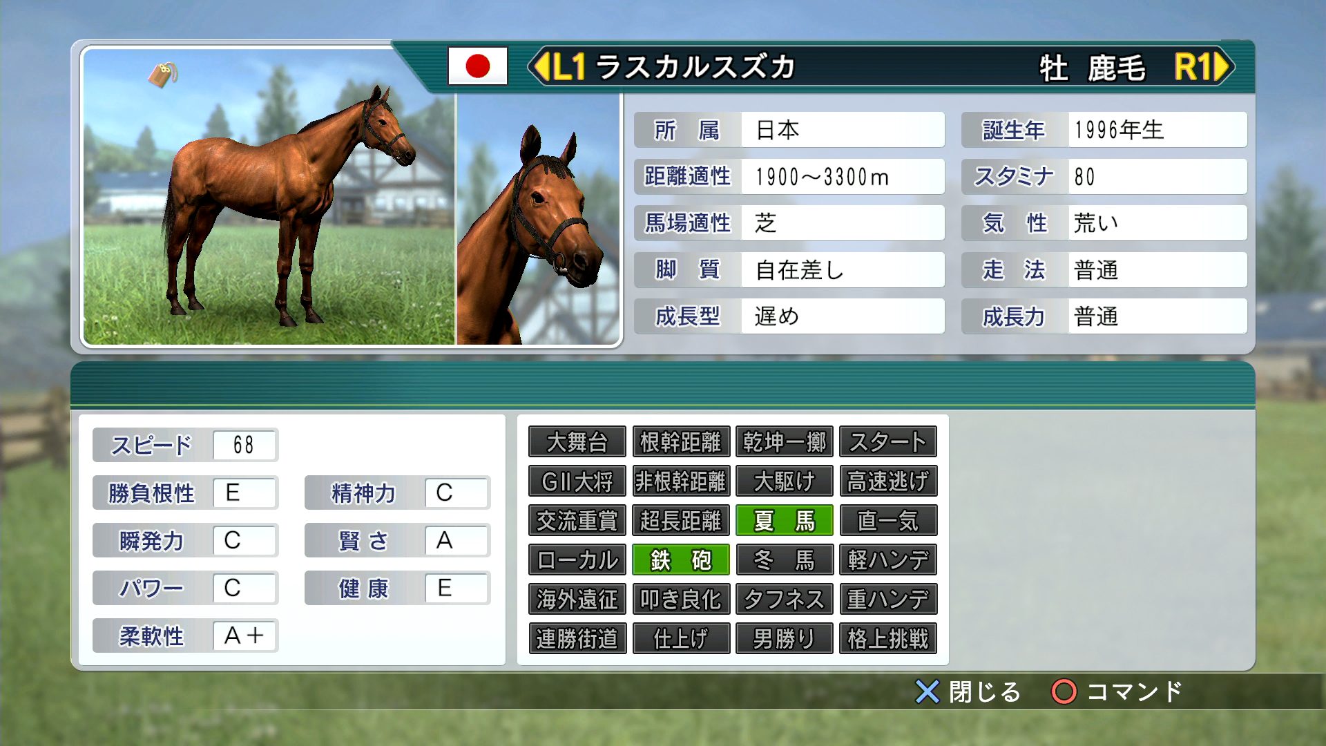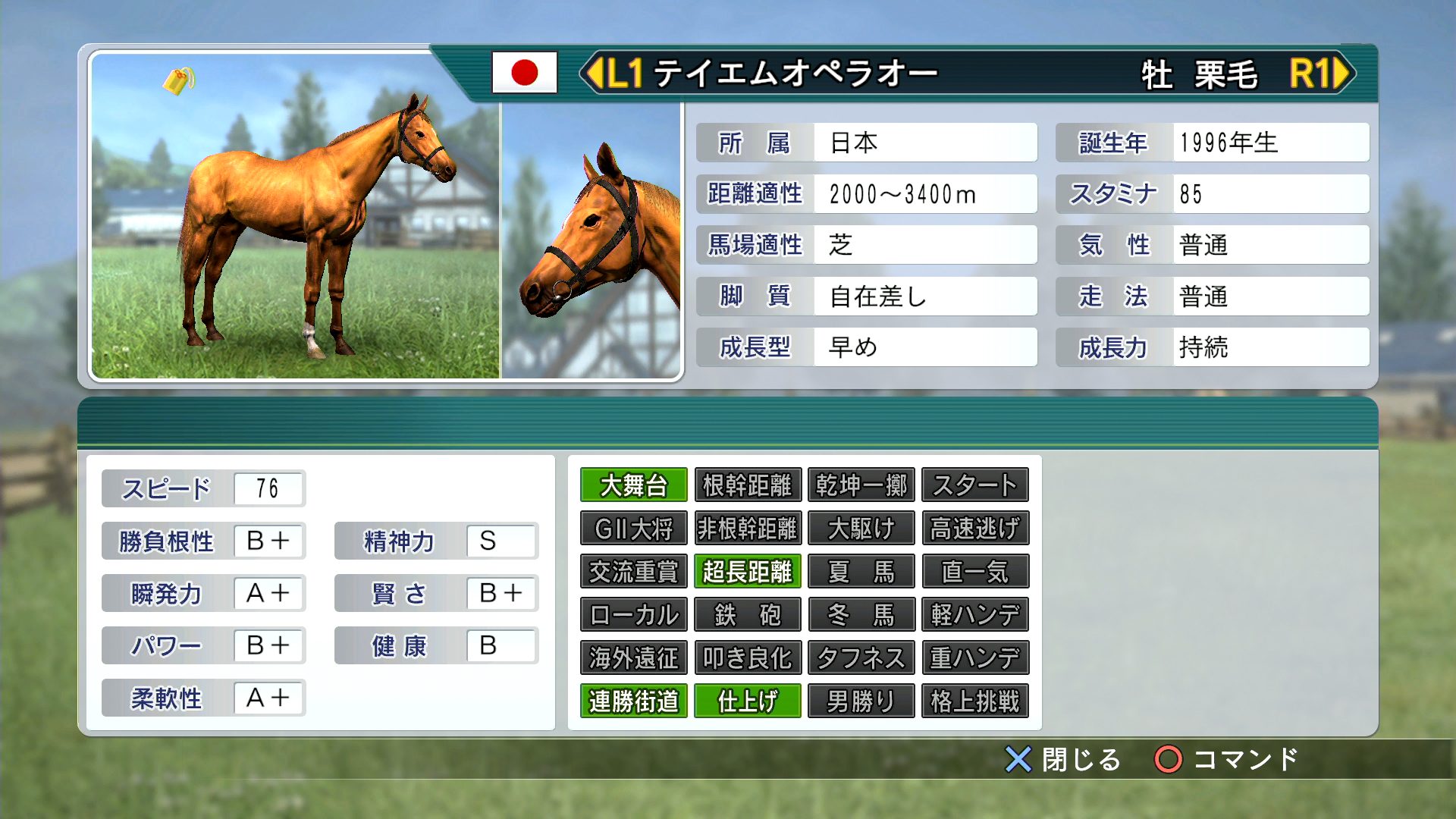 史実では菊花賞でテイエムオペラオーに勝っていますが、モードA以外でそれを再現するのは難しいでしょう。もし所有する場合は海外に活路を見出すのがいいと思います。