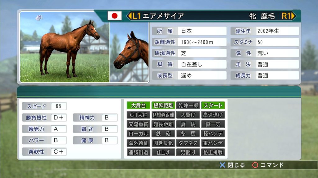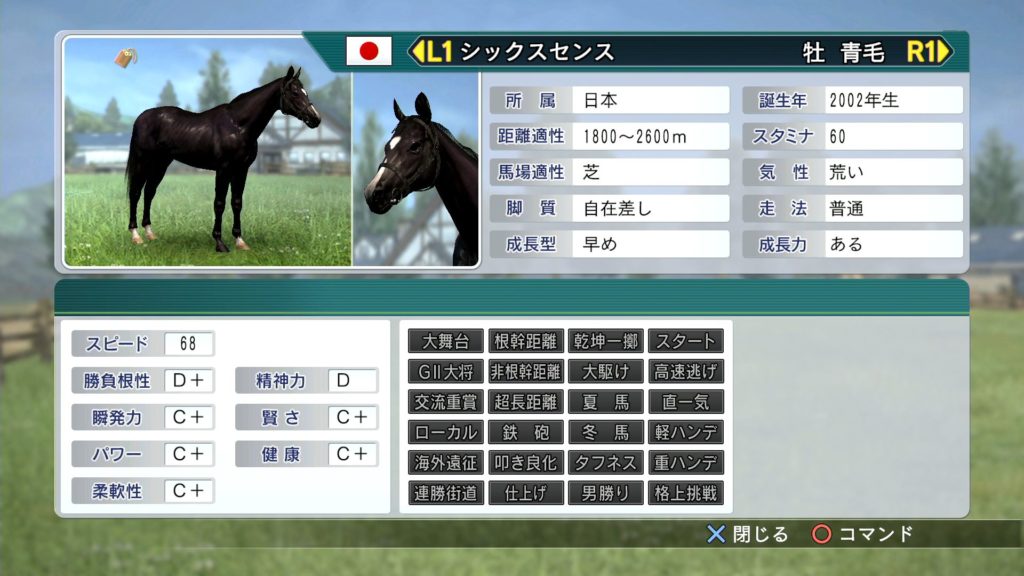 史実では4歳の5月がラストランですが、普通に走らせていれば4歳の終わりでもまだ劣化は始まってないと思うので5歳も走れます。急死していて産駒は残せていない為、ifを楽しみたい人はぜひ。