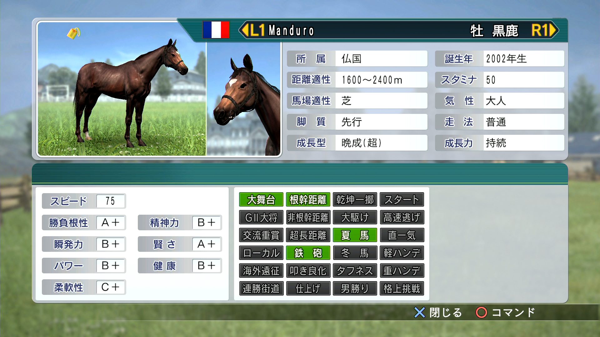 史実では5歳の3月がラストラン。史実通りに引退してしまうと晩成持続の成長力が勿体ないので、6歳以降も走らせるという選択肢もありです(史実馬の消失はありません)。