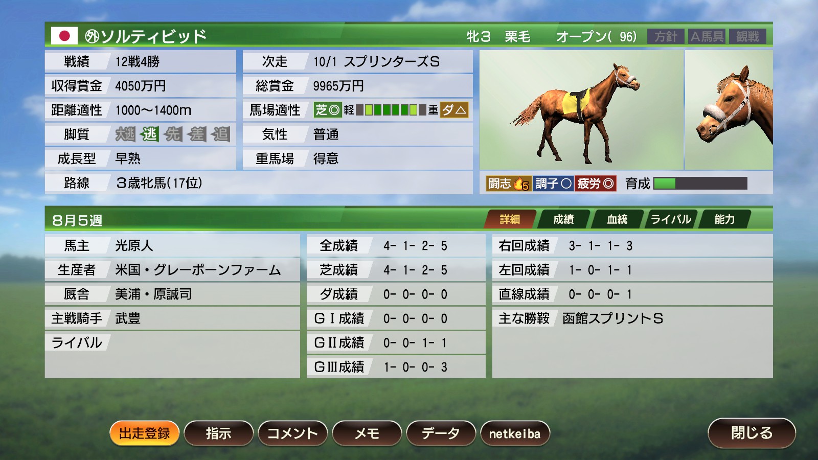 史実では2006年3月の勝利を機に海外の馬主に譲渡されたようで、ゲームにおいてもそこに競争寿命を設定されているような感じでした。オートにしていると7歳も現役を続けようとするので注意が必要です。