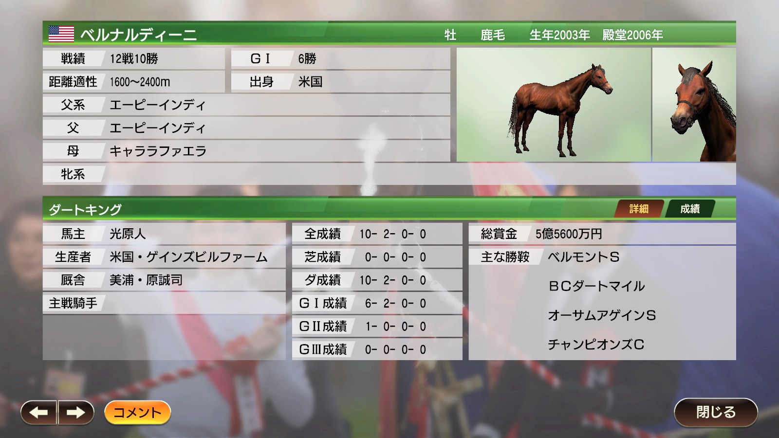 ゲーム内でもその期待度の高さが反映されていて、非常に強いダート馬となっています。それなりのコンディションをキープできれば米国3冠は堅いでしょう。